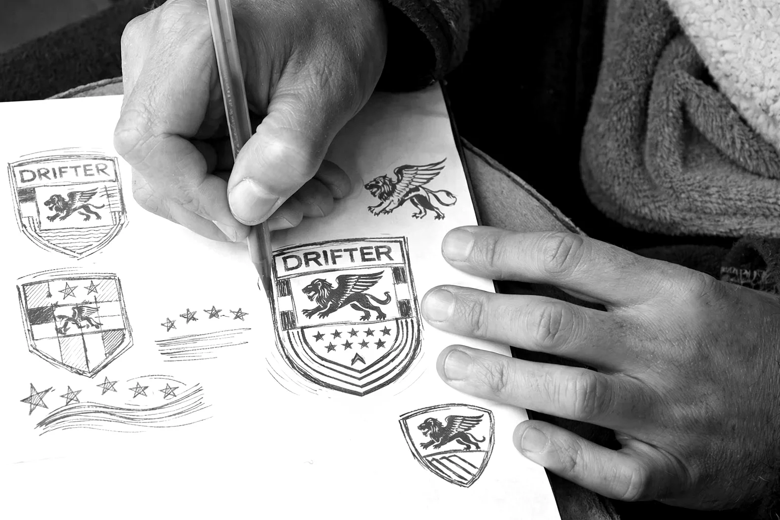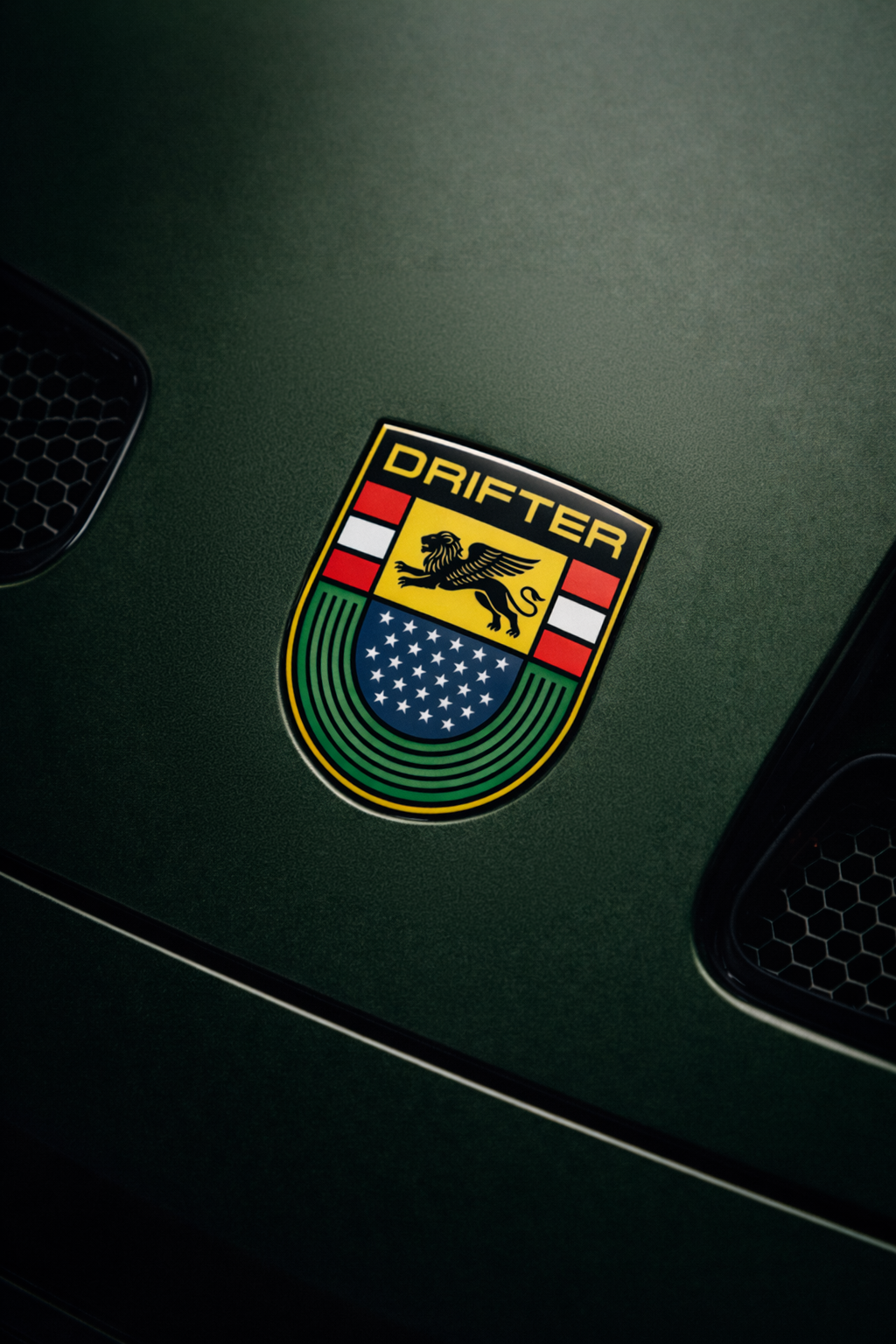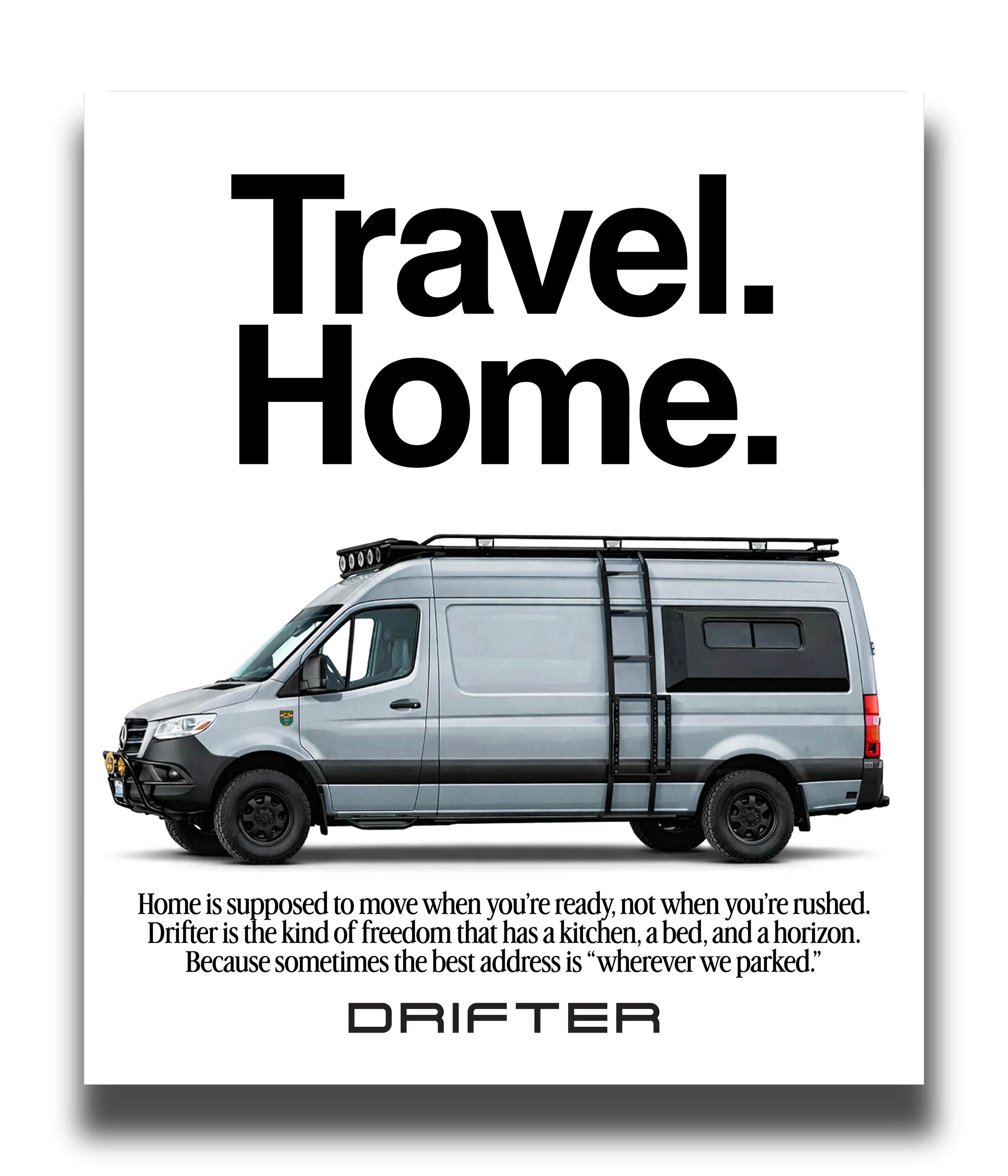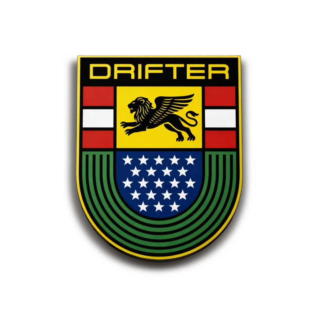 The word DRIFTER rendered in gold reframes the concept of drifting. This is not aimlessness. It is movement without constraint, made possible by competence and self-sufficiency.