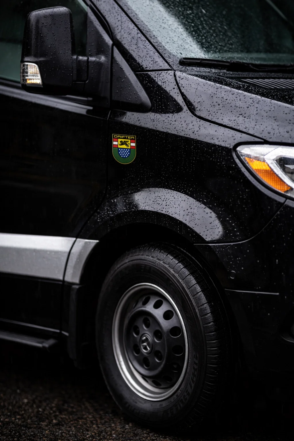 It looks like old money enlisted in the military and started a van company. Heritage crests, restrained insignia, colors that feel like they were chosen by someone who reads propaganda theory for fun.